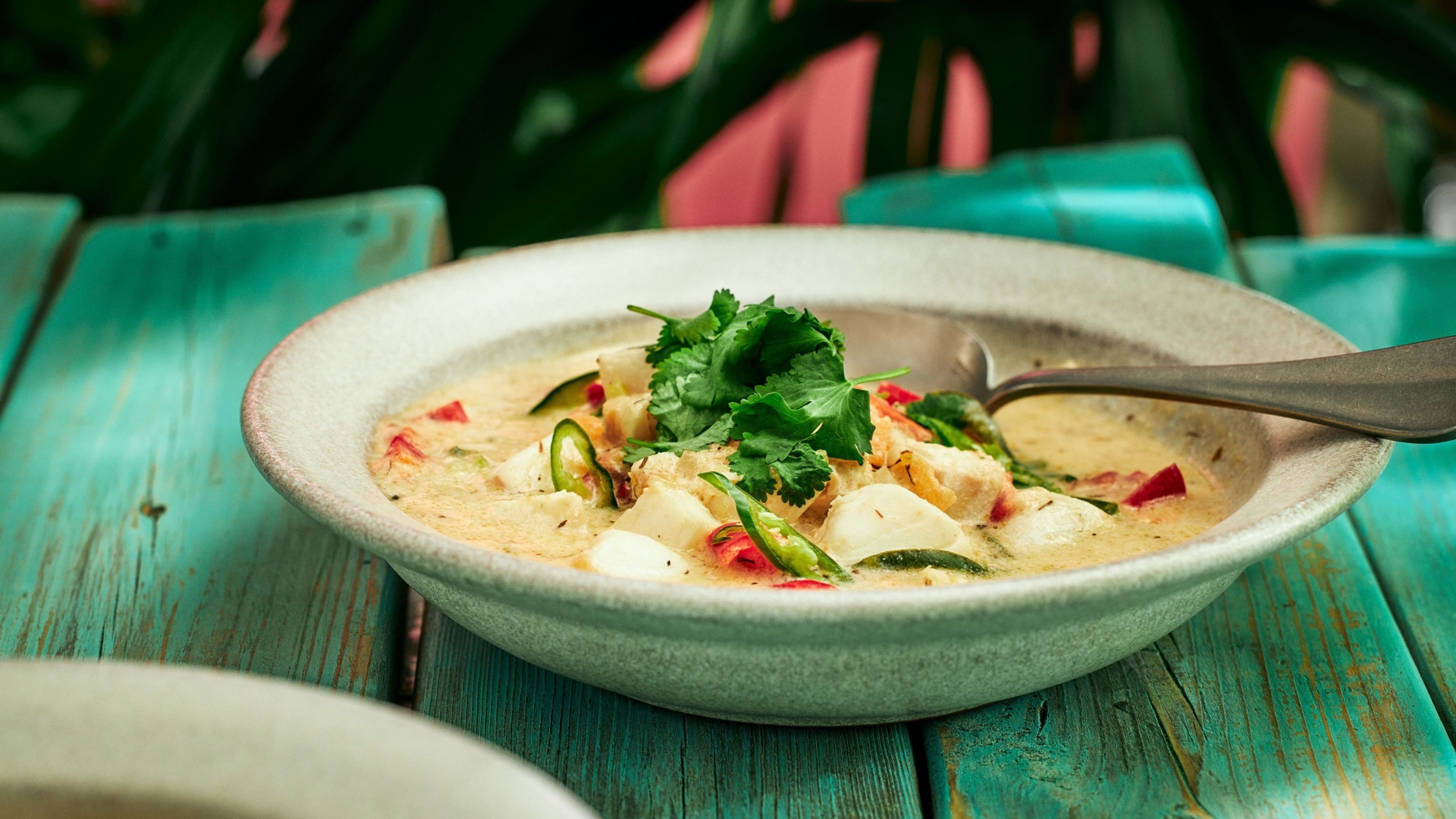 Kunne du måske tænke dig at prøve en caribisk udgave af en vegetarisk gryderet? Denne cremede gryderet er lavet med kokosmælk, smagt til med karry, hvidløg, ingefær og lime, der giver et syrligt twist. Søde kartofler og bønner giver retten en lækker fyldig konsistens, mens ovnbagte majs og nachos-chips giver godt med knas.