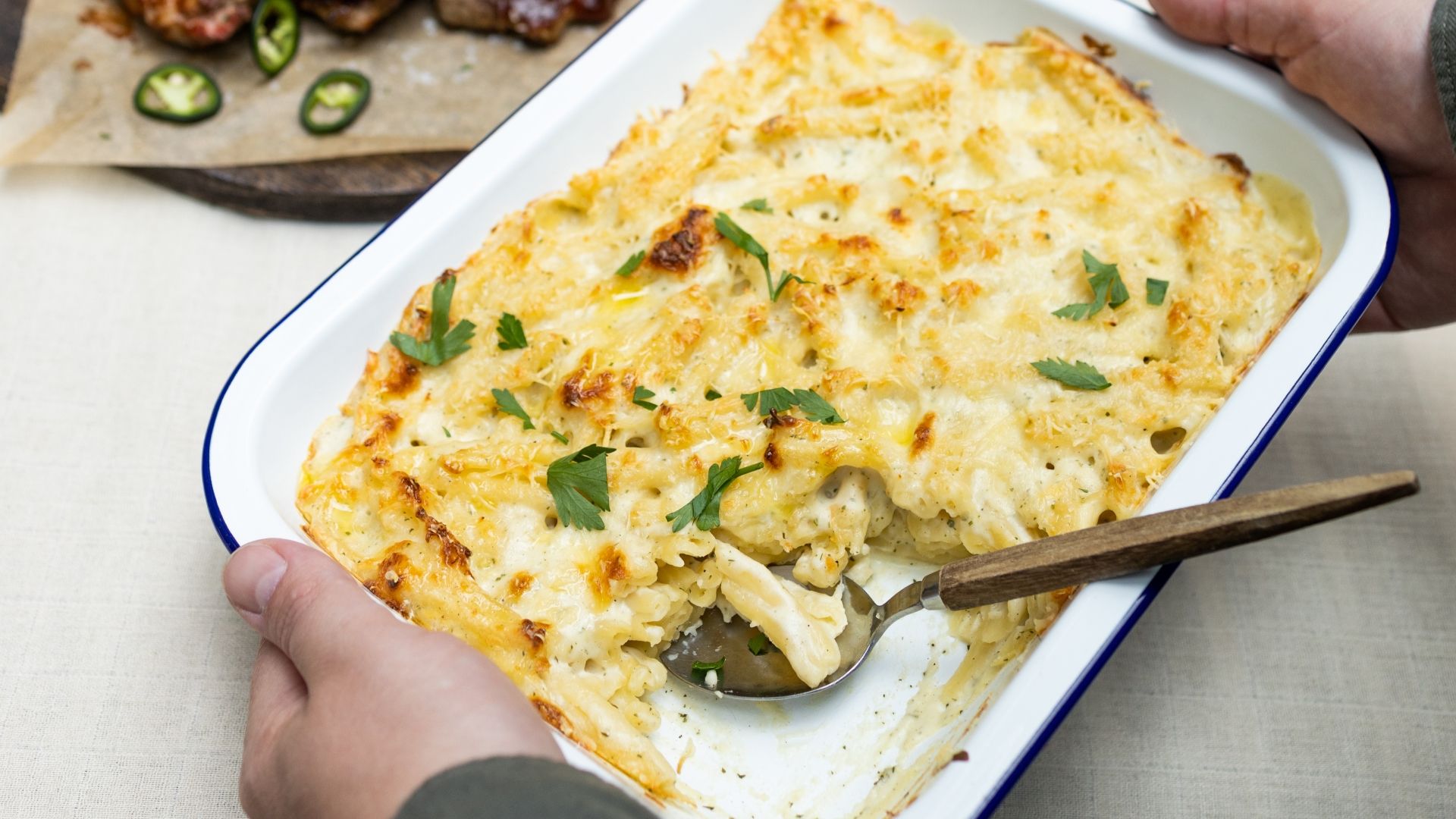 Serveringsforslag: Servér den gratinerede mac & cheese som grilltilbehør til smokey chipotle kyllingebryst og bønnesalat.
