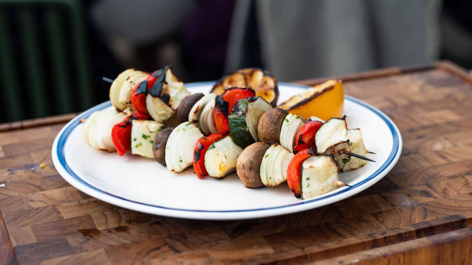 Serveringsforslag: Servér grøntsagsspyddene som grilltilbehør til en saftig bøf med cremet dip efter eget ønske.