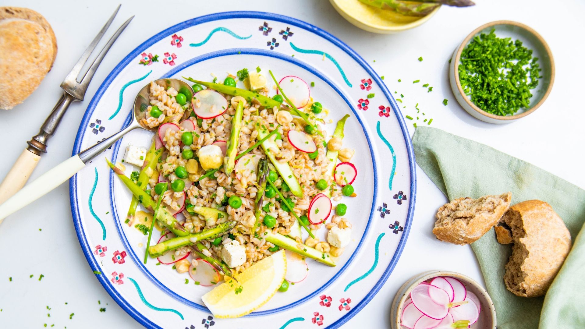 Er du på udkig efter den perfekte vegetariske sommersalat, der både kan spises alene og som tilbehør, må du bare prøve vores opskrift på sommersalat med perlespelt og salatost. Her får du masser af lækker sommergrønt bestående af frisk asparges, radiser, purløg og ærter. I denne opskrift koges først perlespelt, hvorefter den vendes med sennep, olivenolie og citronsaft for masser af god smag. Dernæst vendes perlespelten med kogte asparges og ærter, radiser i skiver, purløg, hakkede hasselnødder og salatost. Server gerne med brød. Asparges, radiser og de hakkede hasselnødder giver sommersalaten en lækker sprød konsistens, der giver godt med bid til salaten.
