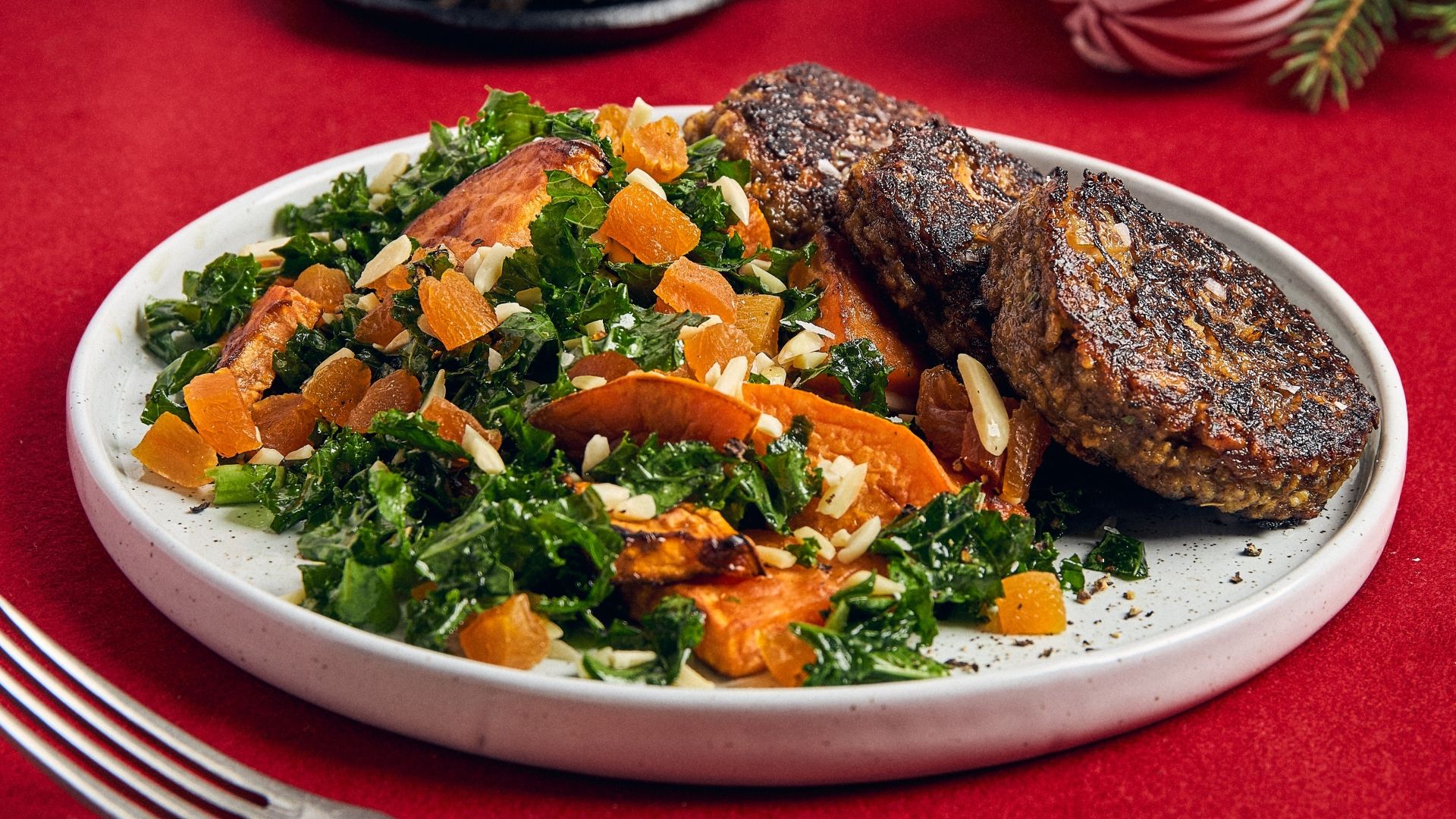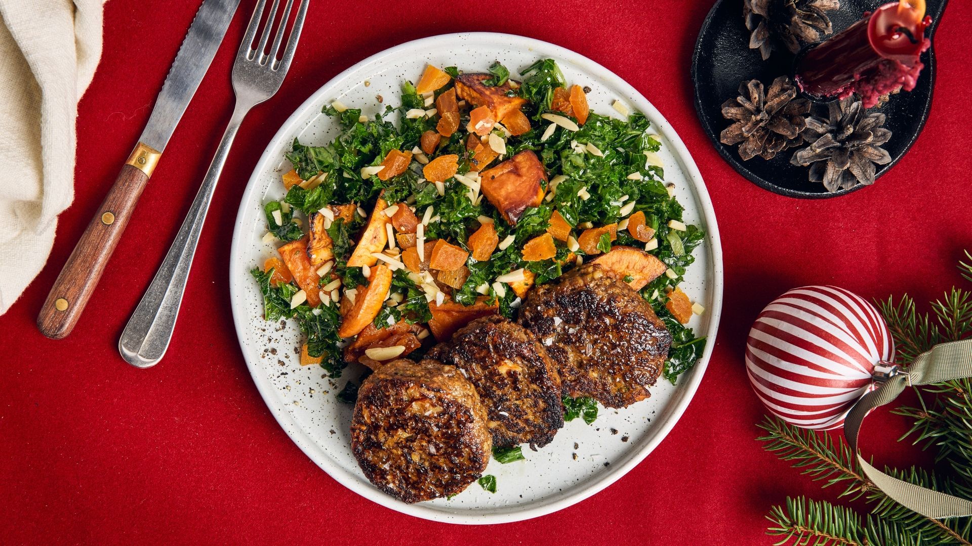 Er du på udkig efter lækre vegetariske juleretter? Sæt smagen i højsædet med vores saftige svampe-nøddefrikadeller, serveret med en frisk grønkålssalat med mandler, abrikoser, søde kartofler og en let dressing – en vegetarisk ret, der imponerer med hver bid.