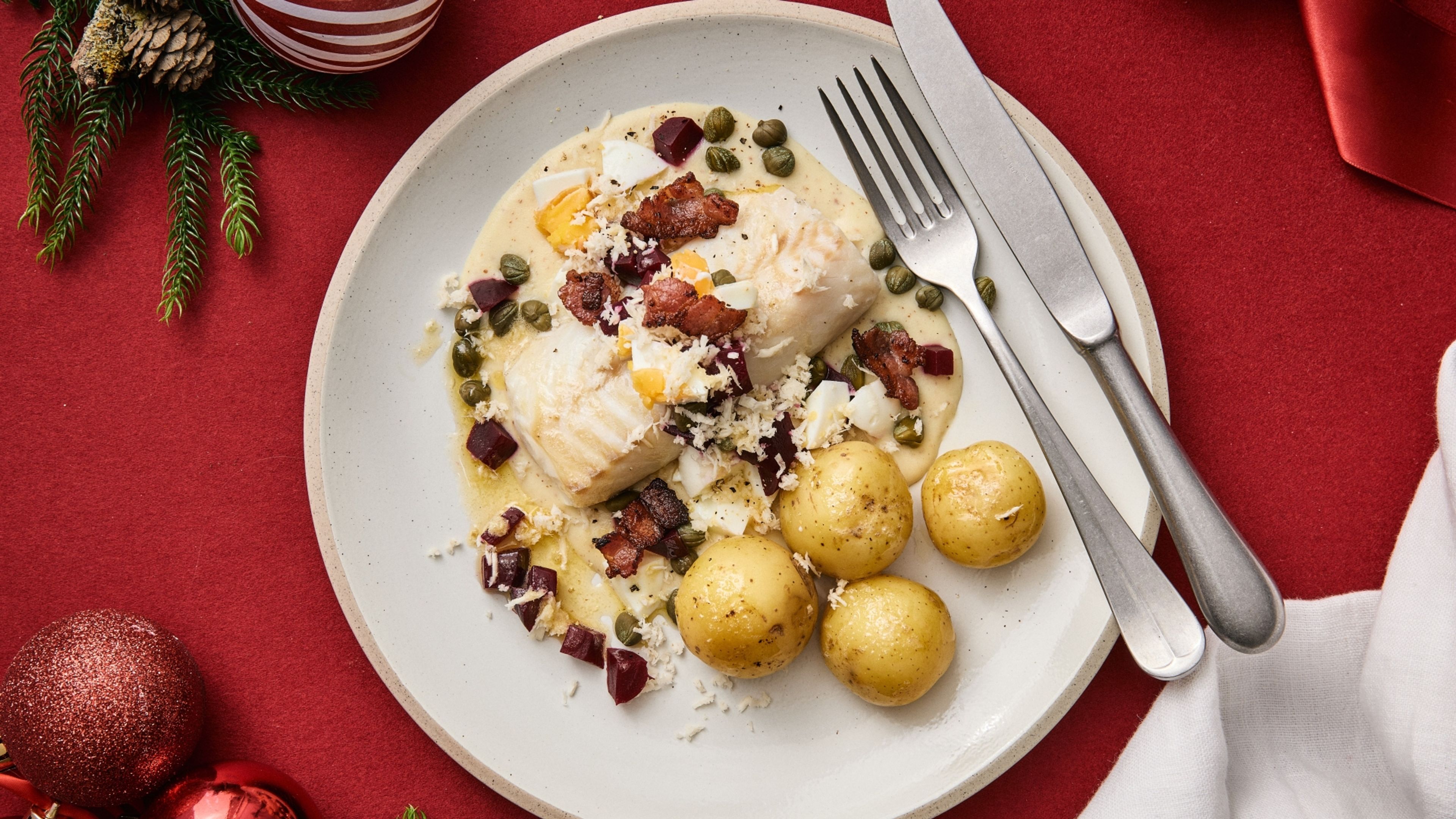 Torskefilet serveret med en cremet sennepsauce og sprød bacon er en kombination, der aldrig slår fejl. Denne juleklassiker er både enkel og elegant, og med tilføjelsen af peberrod, rødbedetern og hakket æg får retten ekstra smag og farve. En sikker vinder hver gang!