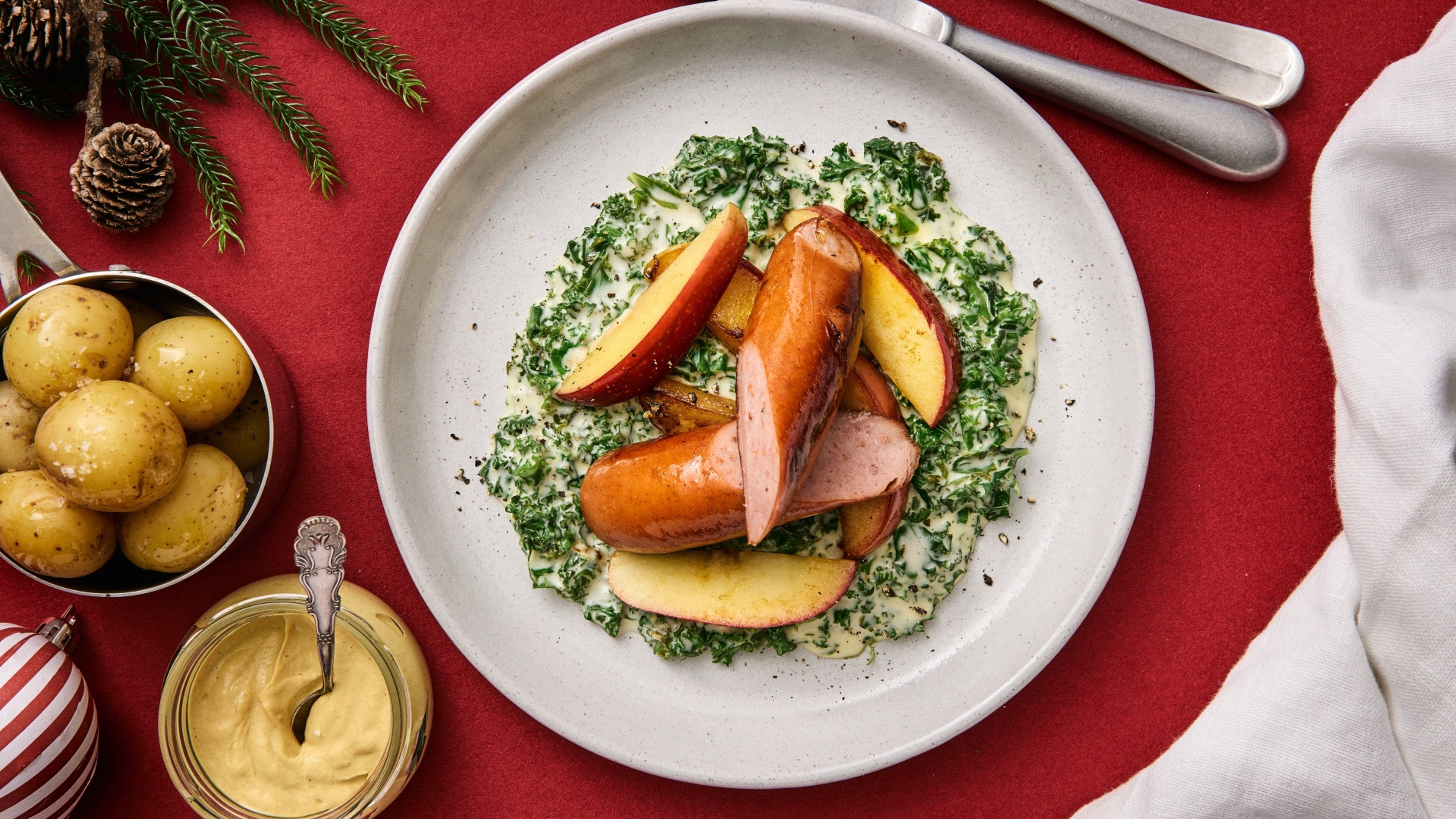Denne ret er en sand juleklassiker, der kombinerer den lækre, krydrede medisterpølse med den rige smag af grønlangkål. Serveret med kartofler, stegte æbler og sennep, får du en skøn balance mellem det salte, det søde og det krydrede. Medister med grønlangkål er simpelthen en ret, der indkapsler alt, hvad vi elsker ved julens smage.