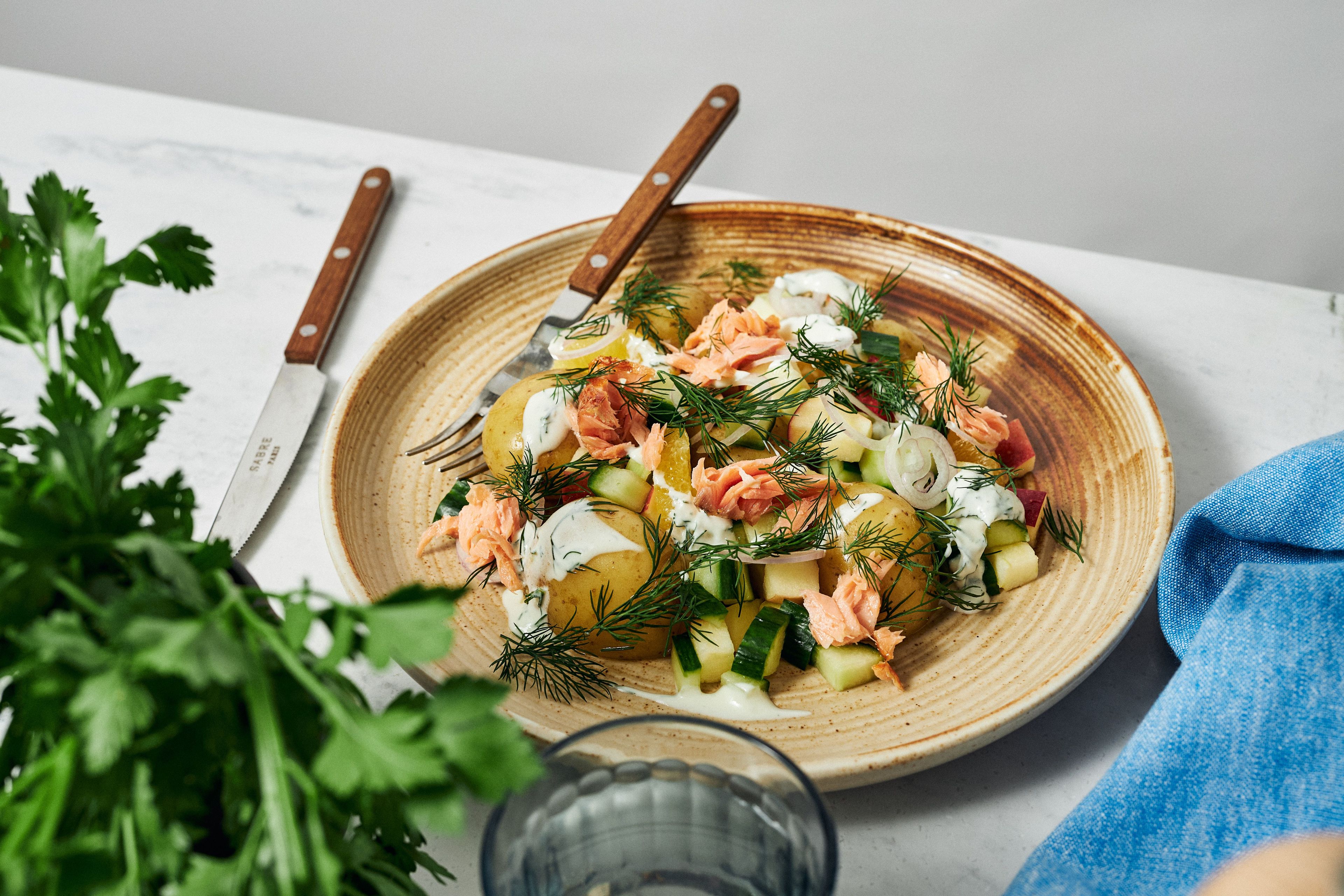 Vores varmrøgede laks med appelsin/æblesalat og dildsauce er perfekt til dig, der gerne vil have en lækker og mættende fiskeret med karakter. Her får du nemlig en vaskeægte smagsbombe serveret på tallerkenen med en sprød æble/appelsinsalat toppet med saftig varmrøget laks. Retten fuldendes med lækre kartofler og dildsauce, der binder hele retten sammen og tilføjer en ekstra dimension af teksturer og smag.