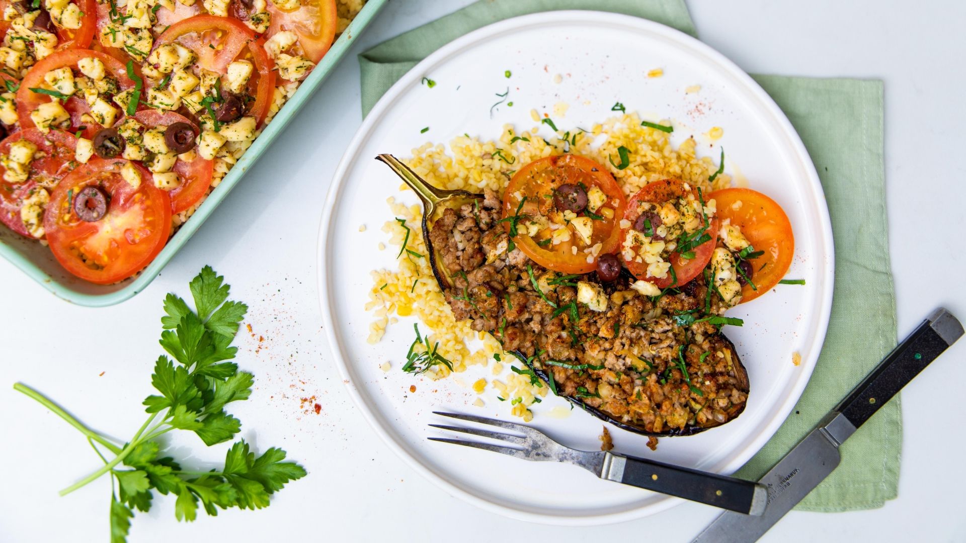 - Fyldte græske auberginer med tomat-bulgur salat