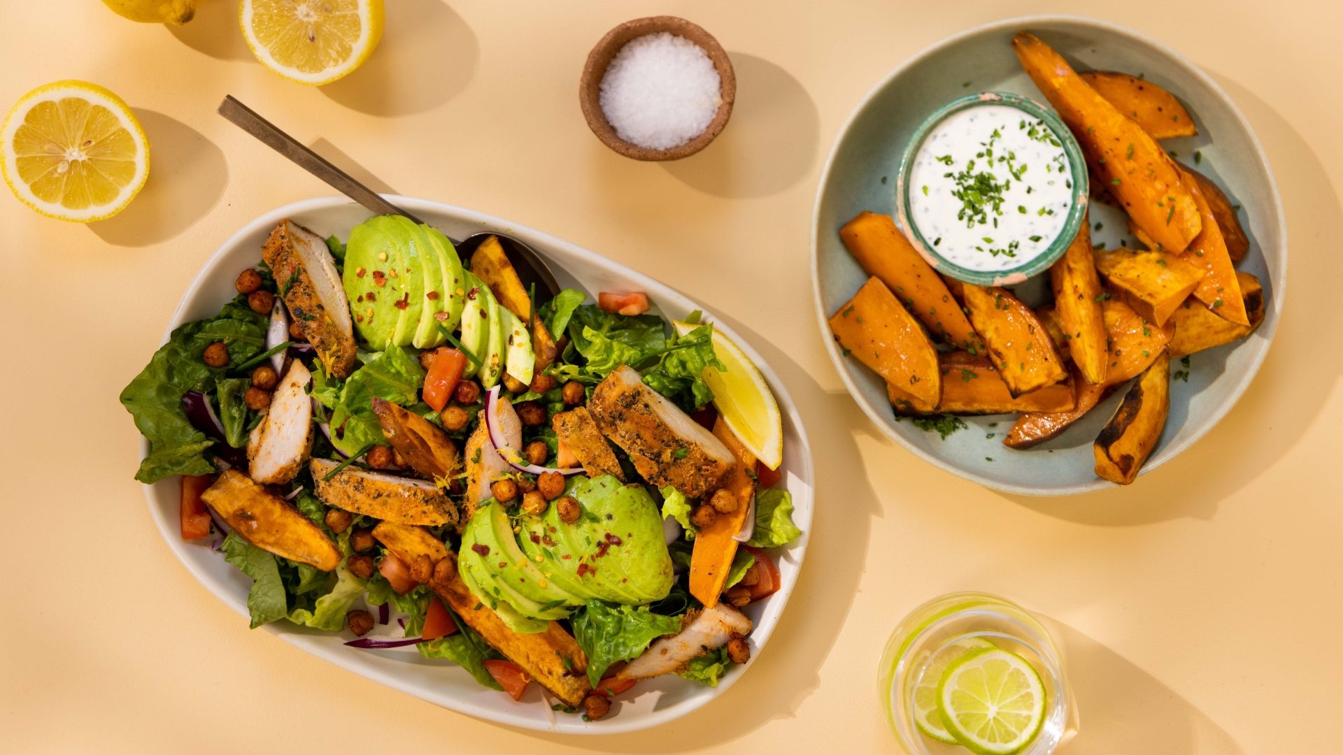 Hvis du går med ønsket om en sundere kost kan du med fordel prøve kræfter med salatretter, der er pakket med grøntsager. Du kan for eksempel prøve at lave vores krydrede California kyllingesalat med sprøde kikærter og avocado. Retten er nem at lave og indeholder masser af grønt. Skal tilbehøret være ekstra lækkert kan du prøve at lave søde kartoffel-fritter med ranch-dressing som dip. Et lækkert alternativ til de klassiske kartoffelfritter.