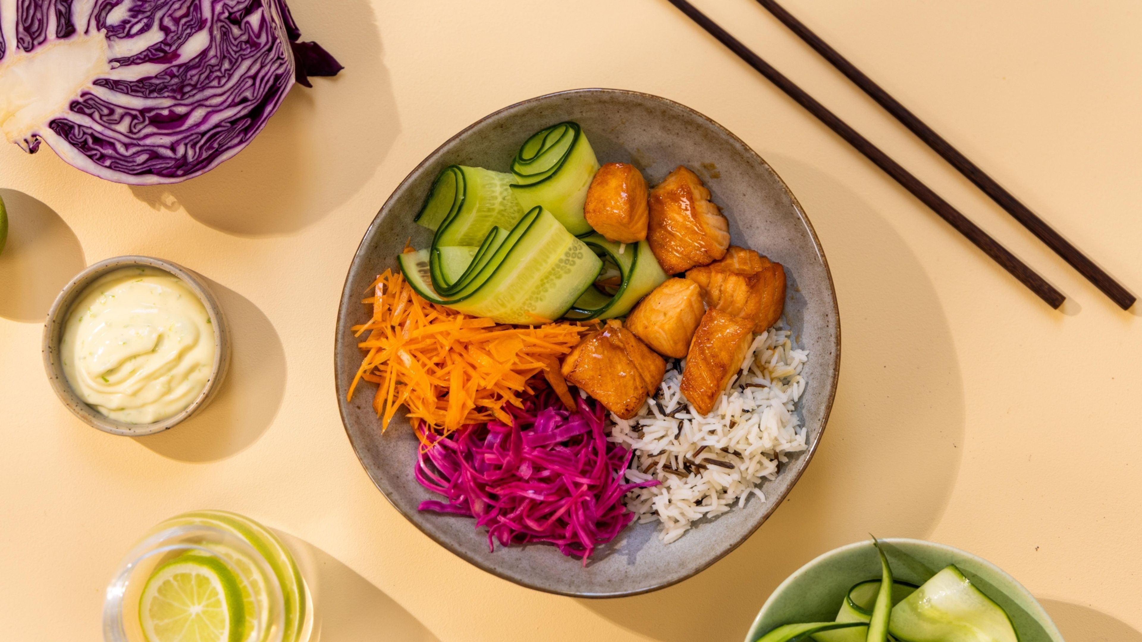 Var det noget med en lækker californisk fiskeret? Så skulle du næsten prøve vores opskrift på en laksebowl med vildris og syltet rødkål. Retten er fyldt med friske grøntsager, og laksefileten marineres i soja og citrusvinaigrette, så den får en fantastisk smag. Ved servering toppes retten med lime-aioli. Lyder det ikke bare lækkert?