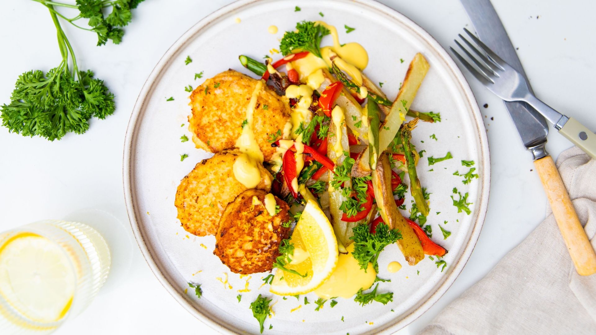 - Fiskefrikadeller med laks, stegte grønne asparges og kartofler