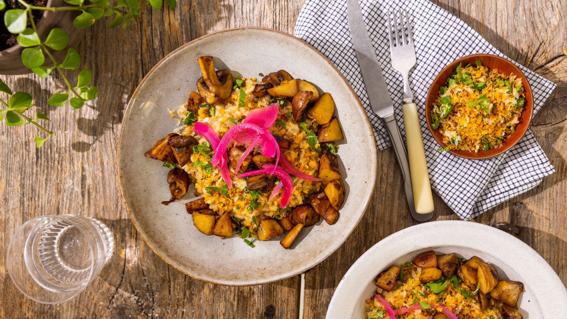 Velsmagende cremet risotto med jordskokker og markchampignon og sprød gremolata pangrattato toppet med syltet rødløg.