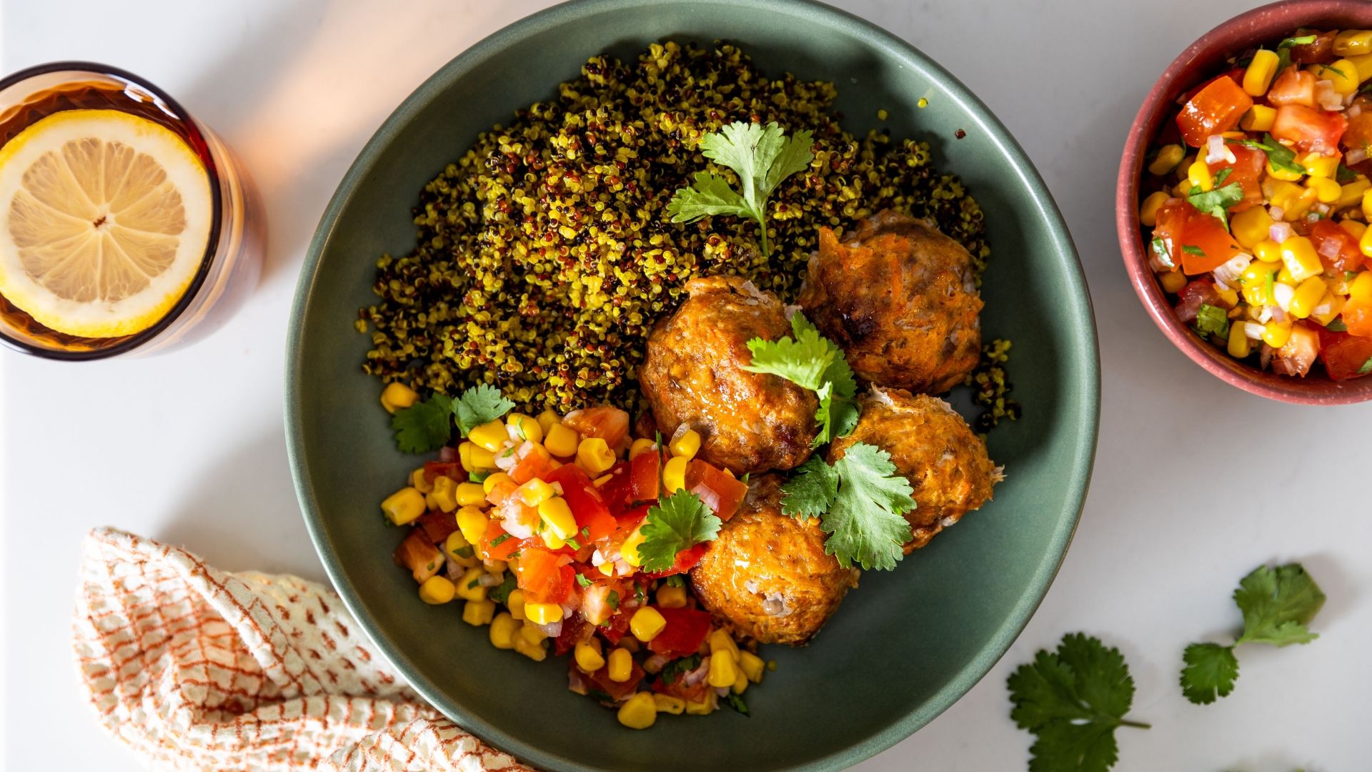 Hurtig bowl med quinoa, krydret svinekød samt en salsa med tomater, majs og koriander.