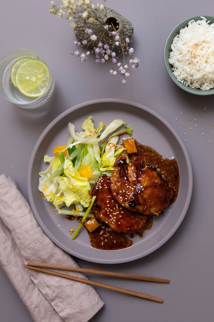De tynde skiver af svinekamfilet får en skøn smag med hoisinsauce og appelsin. Her serveres de med en frisk appelsinsalat, ris og snittet grønt.